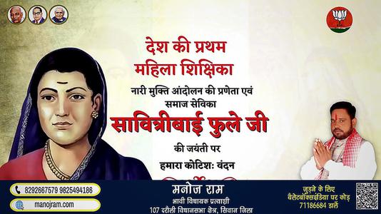 मनोज राम-मातृ शक्ति में शिक्षा की ज्योति जगाने वाली प्रथम महिला शिक्षिका एवं समाजसेविका माता सावित्रीबाई फुले की जी जयंती पर विनम्र अभिवादन